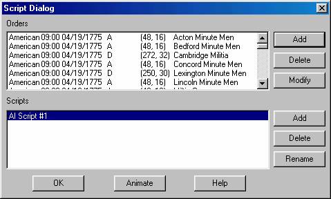 A/I Scripts are used in the main program to direct the A/I whenever a scenario is played using Automatic A/I. The Editor allows you to edit these Scripts in the scenario files. A scenario may have one or more Scripts. When the scenario is played using Automatic A/I, one of these Scripts will be chosen at random and used to direct the A/I. In addition to Scripts, the A/I also uses the A/I flags in the scenario header information (see the Header Dialog) to generate orders.
