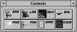 Controlling your ship is performed through the use of 8 independent Control Windows. A set of buttons in its own window (shown left) is provided to quickly allow you to switch between the various control windows. Click on the button to bring up any of these windows. If the SINGLE CONTROL WINDOW menu item is checked, any other control windows that may be showing are automatically minimized (made iconic) when you click a button.