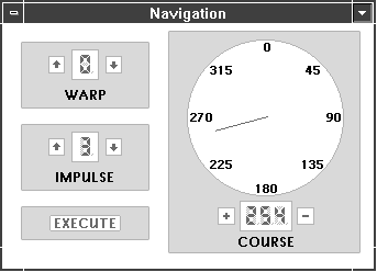 NAV Navigation. This control lets you specify course and distance information to move about the galaxy. You can move within a sector (Impulse power) or from one quadrant to the next (Warp power). You set the direction you want to travel in degrees, and the distance in either Warp or Impulse level.