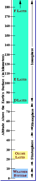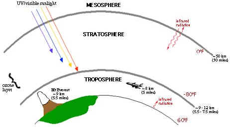 The inhabitants of our planet live in the Troposphere. Earth's atmosphere varies in density and composition as the altitude increases above the surface. The lowest part of the atmosphere is called the troposphere (and it extends from the surface up to about 10 km (6 miles). The gases in this region are predominantly molecular Oxygen ( O2 ) and molecular Nitrogen ( N2 ). All weather is confined to this lower region and it contains 90% of the Earth's atmosphere and 99% of the water vapor. The highest mountains are still within the troposphere and all of our normal day-to-day activities occur here. The high altitude jet stream is found near the tropopause at the the upper end of this region. The layer above this is the Stratosphere, this is where the Ozone Layer is formed. The atmosphere above 10 km is called the stratosphere. The gas is still dense enough that hot air balloons can ascend to altitudes of 15 - 20 km and Helium balloons to nearly 35 km, but the air thins rapidly and the gas composition changes slightly as the altitude increases. Within the stratosphere, incoming solar radiation at wavelengths below 240 nm. is able to break up (or dissociate) molecular Oxygen ( O2 ) into individual Oxygen atoms, each of which, in turn, may combine with an Oxygen molecule ( O2 ), to form ozone, a molecule of Oxygen consisting of three Oxygen atoms ( O3 ). This gas reaches a peak density of a few parts per million at an altitude of about 25 km (16 miles). The Ozone Layer absorbs ultra-violet radiation from the Sun. Without the Ozone Layer life as we know would cease to exist on our planet. Ozone is important because it is the only atmospheric gas which absorbs light in the B region of UVB rays. The Ozone layer extends from a height of 20 kilometers to 60 kilometers above the Earth's surface. The air is very thin at these altitudes. If all of the Ozone in the Earth's atmosphere were compressed into a single layer at the Earth's surface, it would only be 3 millimeters thick-basically two stacked pennies! The gas becomes increasingly rarefied at higher altitudes. At heights of 80 km (50 miles), the gas is so thin that free electrons can exist for short periods of time before they are captured by a nearby positive ion. The existence of charged particles at this altitude and above, signals the beginning of the ionosphere a region having the properties of a gas and of a plasma. |