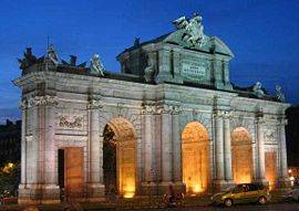 Puerta de Alcalá at night with El Retiro gardens in the background.