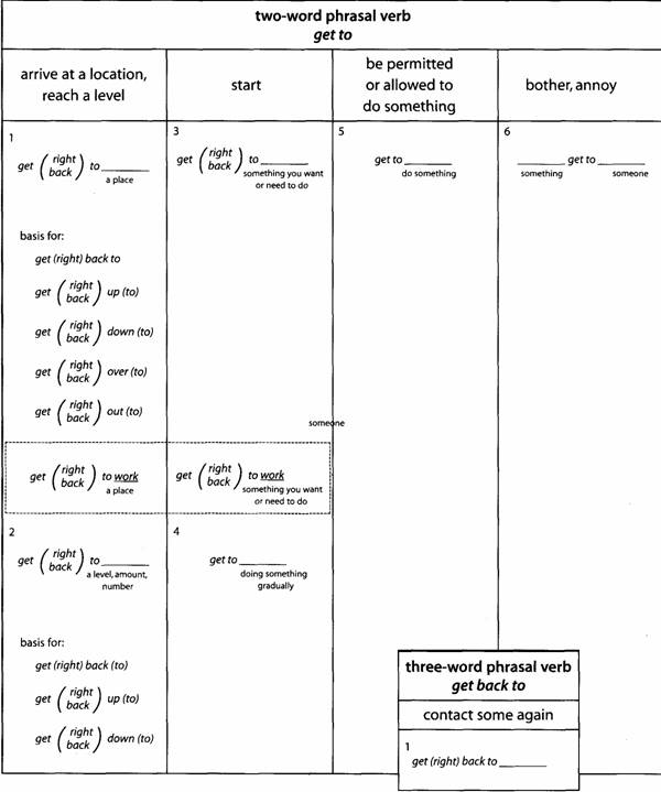 The focus of this section is an expanded definition of the two-word phrasal verb get to and the three-word phrasal verb get back to. The purpose is to try to make some sense out of a seemingly limitless number of idiomatic combinations of get, to, and various particles and adverbs, in particular right and back, and to demonstrate that many phrasal verbs comprised of get and a particle are actually variations of get to that can be modified with right andlor back.