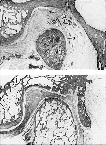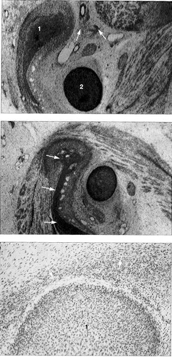 Below: Sagittal section of a temporomandibular joint at the same stage of development. Above the condyle (1) is a distinct concentration of mesenchymal cells (arrows). At its inferior region the mesenchymal thickening is already beginning to detach from the condyle as the lower joint space forms. During this time the first collagen fibers of the disk become visible and increase greatly in number until the twelfth week.