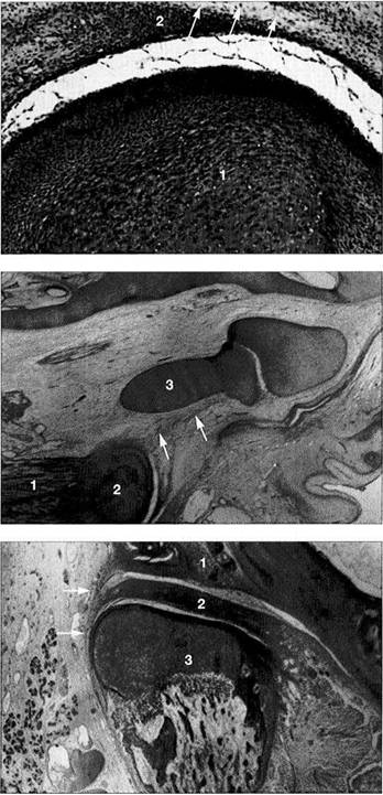 Frontal section through a human temporomandibular joint in the eighteenth week of embryonic development. The fossa (1), disk (2) and condyle (3) are completely developed and from now on will experience only an increase in size. The joint capsule (arrows) can also be clearly identified. The cartilaginous condyle will ossify further. Distribution of cartilage at this stage indicates that future growth will be primarily in the laterosuperior direction.