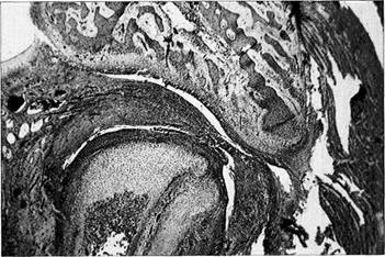 Above: A human temporomandibular joint in the frontal plane at the eleventh week of development. This represents the same area shown in Figure 19 only 10 days further along. The condylar process is beginning to ossify (arrows). At this time the swallowing reflex is also developing and is accompanied by the formation of secondary cartilage in the temporomandibular joint (Lakars 1995).