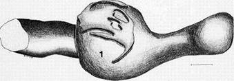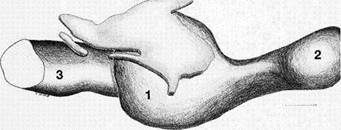 Above: Three-dimensional reconstruction from a series of histological sections of the developing joint space (yellow) of a right temporomandibular joint. In the center of the picture is the condyle (1); to the right of it lies the coronoid process (2). To the left behind the condyle is Meckel's cartilage (3). The upper joint space arises approximately 2 weeks after the lower.