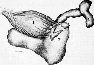 Three-dimensional representation of the insertion of the lateral pterygoid muscle (1) onto a left temporomandibular joint. As the muscle develops from the eleventh week, its upper belly attaches to the condyle, capsule, and disk while its lower belly attaches only to the condyle (2). At no time during development do the fibers of the lateral pterygoid muscle make direct contact with Meckel's cartilage (Ogutcen-Toller and Juniper 1994).