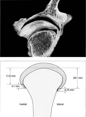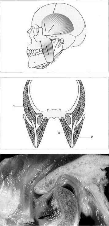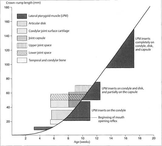 In an embryo with a CRL of approximately 53 mm the coro-noid process and the condylar process can already be clearly distinguished from one another. The biconcave form of the articular disk becomes apparent at a CRL of 83 mm. In histological preparations, fibers of the pterygoid muscle can also be seen streaming in quite early (Radlanski et al. 1994). At this stage the superior belly of the lateral pterygoid muscle inserts at the middle and central third of the disk and the lower belly inserts at the condyle (Merida-Velasco et al. 1993). At a CRL of 95 mm all structures of the temporomandibular joint can be clearly identified and thereafter undergo no essential change other than an increase in size (Bontschev 1996).