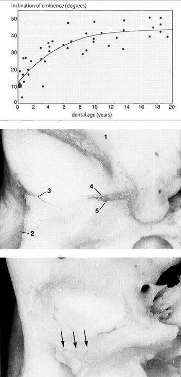 This graph (adapted from that of Nickel et al. 1988) indicates the inclination of the posterior slope of the eminence (articular protuberance) in relation to the occlusal plane. Accordingly, at the age of 3 years the eminence has reached 50% of its final shape (Nickel et al. 1997). Between the tenth and twentieth year there is a difference of only 5°. The study material originates from the osteological collection of Hamman-Todd and Johns Hopkins, Cleveland Museum of Natural History.
