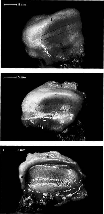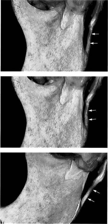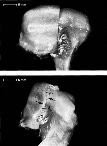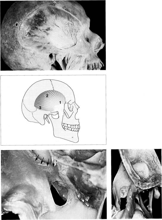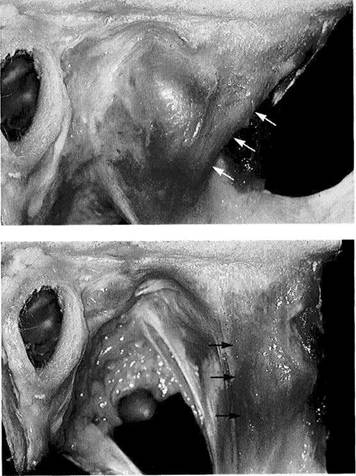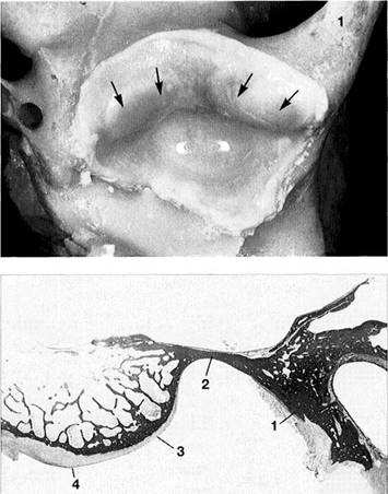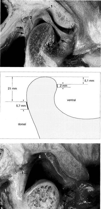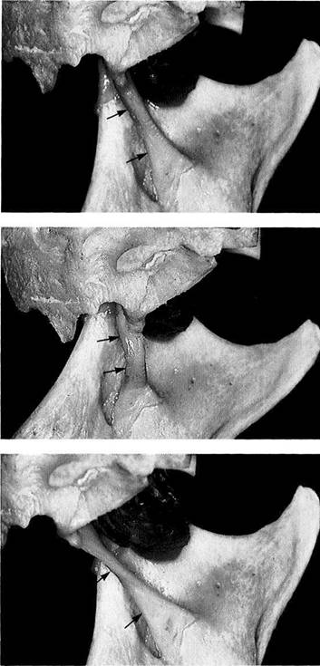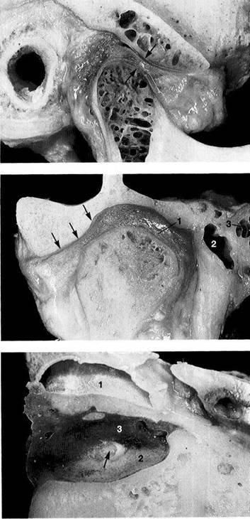 Inferior view of a temporal bone with partially ossified fissures. The lateral half of the squamotympanic fissure is completely ossified (arrows). The superior stratum of the bilaminar zone can now insert only into the periosteum in this region. It has been shown that these fissures are ossified in more than 95% of patients with disk displacement, whereas in joints without disk displacement normal fissure formation prevails (Bumann et al. 1991).