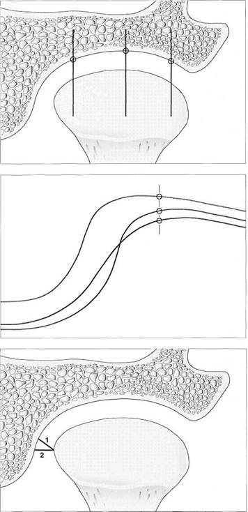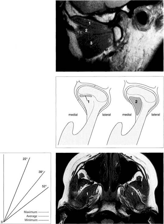 The temporal portion of the joint can be divided into four functional parts from posterior to anterior: postglenoidal process, glenoid fossa, articular protuberance, and apex of the eminence. The inclination of the protuberance to the occlusal plane varies with age and function (Kazanjian 1940), but is 90% determined at the age of 10 years (Nickel et al. 1988). Three fissures can be found at the transition to the tympanic plate of the temporal bone: the squamotym-panic, petrotympanic, and petrosquamous fissures (Fig. 28). In patients with disk displacement, these fissures are fre-