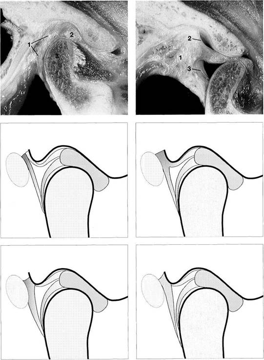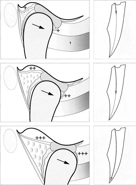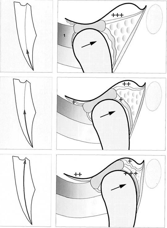 Once the jaws are closed the elastic structures are again relaxed. The inferior stratum becomes increasingly tense and finally prevents anterior disk displacement in case the condyle moves too far distally. Anterior disk displacement can occur only in the presence of an overstretched inferior stratum, with or without flattening of the pars posterior (Eriksson et al. 1992).