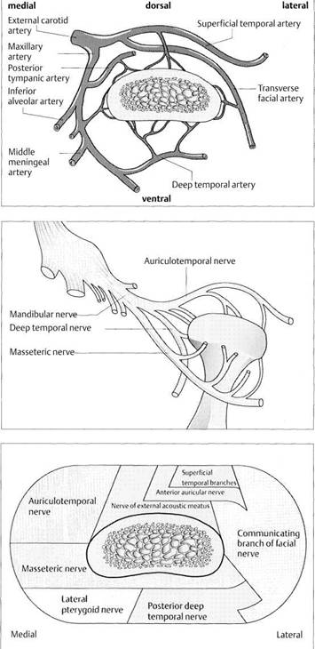 During the tenth week the first blood vessels become organized around the joint. The disk has small blood vessels only at its periphery and is itself avascular (Valenza et al. 1993). Branches of the trigeminal and auriculotemporal nerves are clearly visible in the twelfth week (Furstman 1963). The numerous nerve endings that can still be seen in the disk in the twentieth week diminish rapidly so that after birth the disk is no longer innervated (Ramieri et al. 1996).