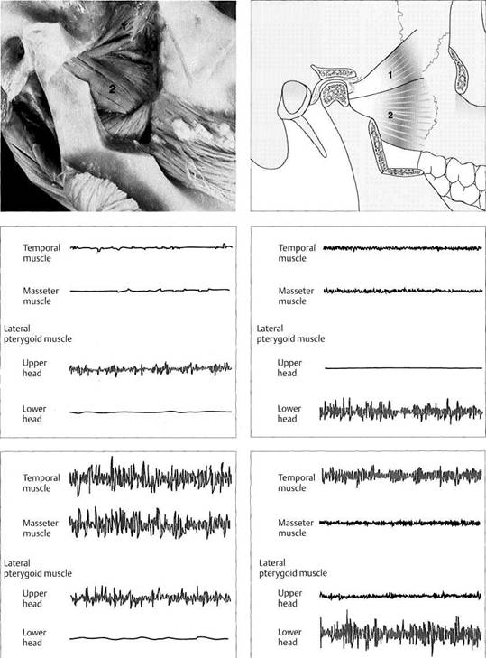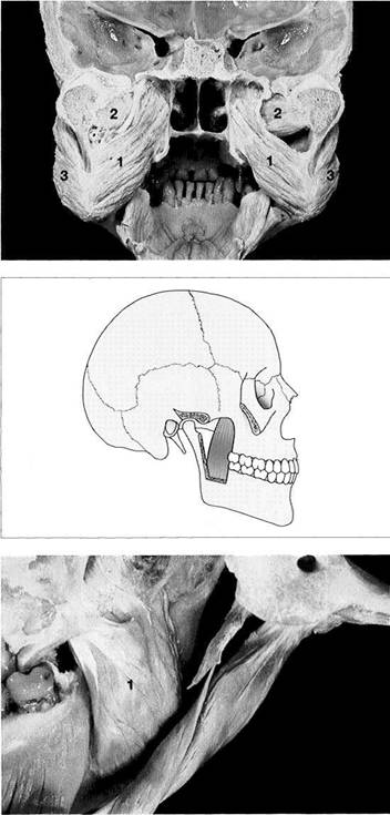 The jaw is closed by the temporal, masseter, and medial pterygoid muscles and the upper heads of the lateral pterygoid muscles. The lower head of the lateral pterygoid muscle is inactive during jaw closure. As described previously, the temporal and masseter muscles also insert on the anterior part of the joint capsule. This maintains the basic level of tension necessary for the receptors in the joint capsule to function. It is a fundamental fact that during closing movements the disk executes an anterior movement relative to the condyle. As the condyle is being drawn posteriorly by the muscles, other structures are guiding the disk posteri-