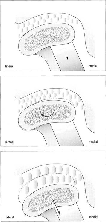 In this phase the upper head further stabilizes the condyle on the articular protuberance. Tension in the superior stratum steadily diminishes, and the disk, because of the bulge of its pars posterior, is passively carried farther distally. A nonphysio-logical increase of pressure in the genu vasculosum due to sympathetic or hormonal influences would exert an anteriorly directed force on the disk (Ward et al. 1990). This can lead to increased tension in the inferior stratum and flattening of the disk.