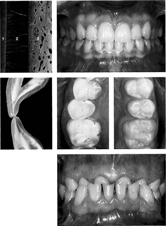 Left: Microscopic view of the histology of a periodontal space: cemen-tum (1), collagen fibers (2), alveolar bone (3).