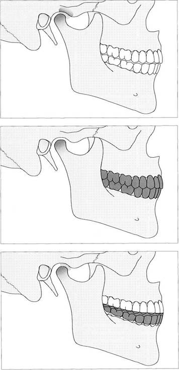 This indicates the most commonly assumed tooth contacts. These can be many or, with a malocclusion, few. Habitual occlusion determines the habitual condylar position. With the teeth in habitual occlusion the condyles may be displaced in the sagittal plane either posteriorly (yellow) or anteriorly (gray) from the centric condylar position. Lateral displacement is also possible. All the joint structures may adapt successfully to this condition.