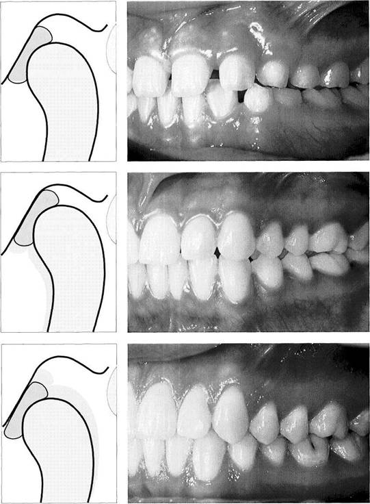 Left: Relation of the incisors in protrusive position. The periodontal membranes of the incisors have the highest concentration of mechanoreceptors. Furthermore, their threshold of stimulation is significantly lower than that of the molars.