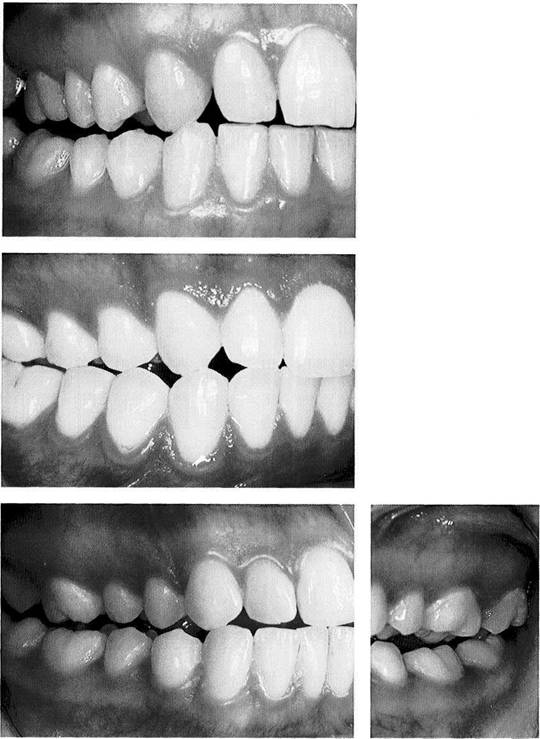 With canine guidance, not only should all the other teeth disclude (vertical disclusion), but only the distal slope of the lower canine should slide against the mesial slope of the upper canine. This arrangement also provides a so-called "sagittal protection." This is important from a prophylactic standpoint because it helps keep the condyle from impinging upon the sensitive bilaminar zone during lateral movements (see p. 48).
