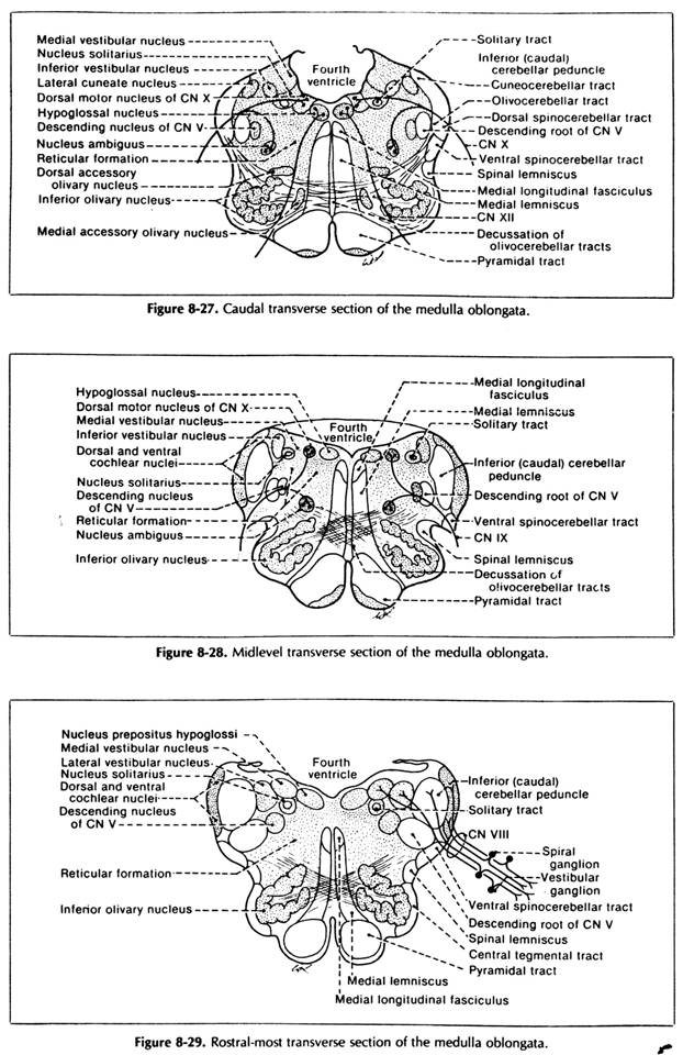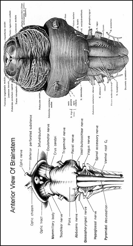 on the ventral face we can also describe the apparent origins of CN-VII, CN-VII bis and CN-VIII lying at the level of bulbo-pontine sulcus; above the olive lie CN-VII, and VII-bis) and near the inferior cerebellar peduncle lies CN-VIII;