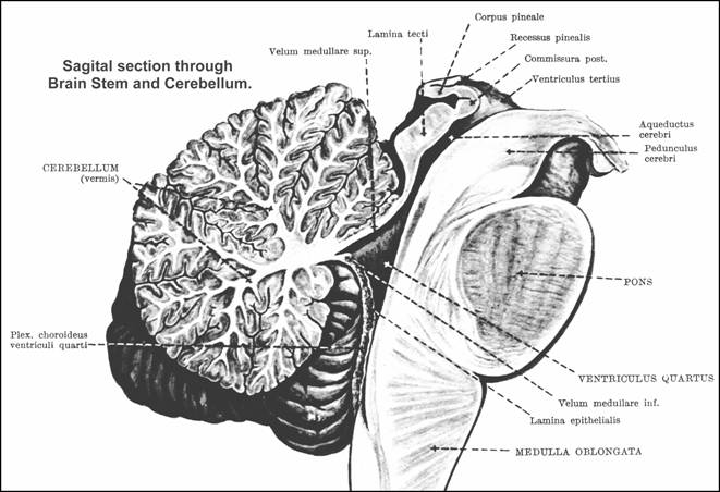 dorsally to the pons and to the sup. 1/2 of the medulla (which is called the "open part of the medulla");