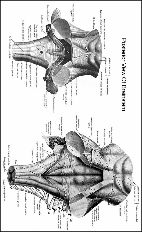Dorsa1 face cannot be seen due to the cerebellum that covers it; it forms the sup. triangle of the floor of the IVth ventricle and a part of its roof (sup. medullary vellum); for this reason it will be studied together with the other components of the IVth ventricle;