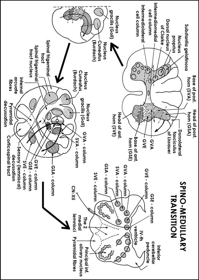 a cranial half - here appears the inferior triangle of the IVth ventricle which determine the 2 fasciculi gracilis to diverge; each fasciculus gracilis and cuneatus presents in its terminal part (immediately above their diverging place) a swelling called tuberculus gracilis (or clava) and tuberculus cuneatus, each one being determined by the corresponding underlying nuclei gracilis and cuneatus; cuneatus tuberculi have a higher localisation than gracilis ones; the 2 fasciculi gracilis and cuneatus seem to be continued rostrally by the inf. cerebellar peduncles, but in reality, fasciculi gracilis and cuneatus finish their fibres in the nuclei with the same name; the inf. cerebellar peduncles lie on the both inf. margins of the IVth ventricle and enter the white matter of cerebellum;