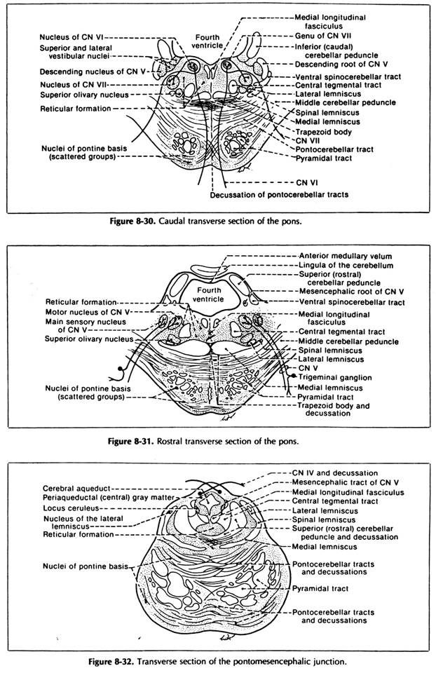 The superior limit (between pons and midbrain) is represented by the ponto-peduncular sulcus which surrounds the anterior and lateral faces of the brainstem at this level;