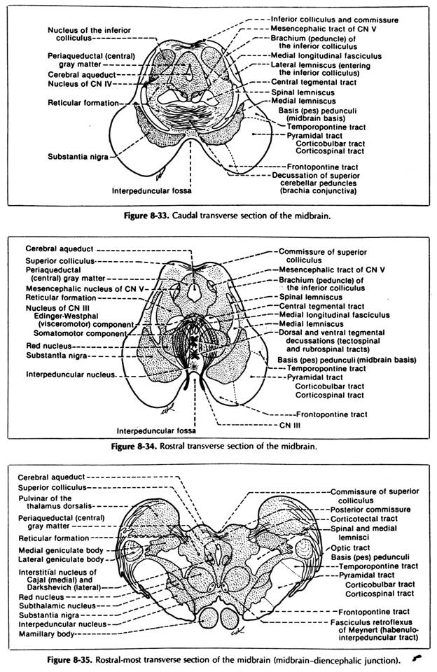 At the midbrain level all the lemnisci described until now form a curved band postero laterally to the substantia nigra; the concavity of the curved band (on transverse section) is oriented posteromedially;