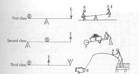 Fig. 4-4 There are three classes of levers. Classification is based on location of fulcrum, F; resistance, R; and direction of effort (force), E. Examples of each class are illustrated. |