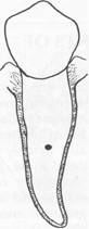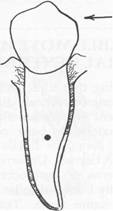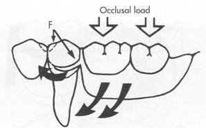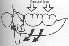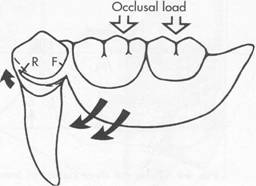 Fig. 4-10 More periodontal fibers are activated to resist forces directed vertically on tooth than are activated to resist horizontally (off-vertical) directed force. Horizontal axis of rotation is located somewhere in root of tooth. |