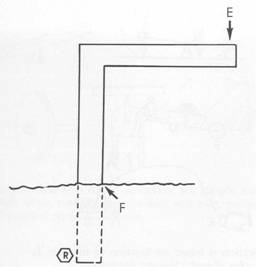 Fig. 4-5 Length of lever from fulcrum, F, to resistance, R, is called resistance arm. That portion of lever from fulcrum to point of application of force, E, is called effort arm. Whenever effort arm is longer than resistance arm, mechanical advantage is in favor of effort arm, proportional to difference in length of the two arms. In other words, when effort arm is twice the length of resistance arm, 25-pound weight on effort arm will balance 50-pound weight at end of resistance arm. |