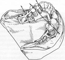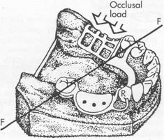 Fig. 4-3 Distal extension removable partial denture will rotate when force is directed on denture base. Differences in displaceability of periodontal ligament, supporting abutment teeth, and soft tissues covering residual ridge permit this rotation. It would seem that rotation of denture is in combination of directions rather than unidirectional. |