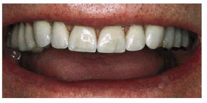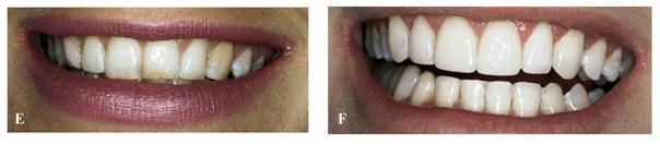 Figur 323s1823d e 18-3E and F: Three porcelain laminates were placed on the central incisors and right lateral. The new laminates also achieved the objective to eliminate the incisal translucency.