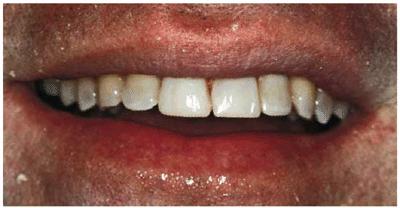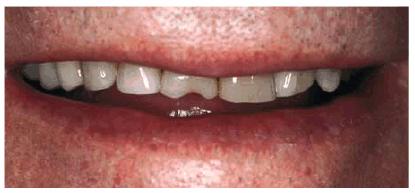 Figur 323s1823d e 18-5A: This 65-year-old man had fractured his right central incisor. Because he desired a younger and brighter looking smile, six porcelain laminates were treatment planned.