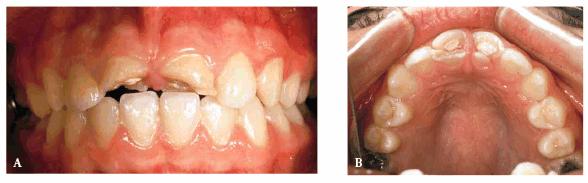 Figur 323s1823d e 18-4A and B: This 17-year-old student fractured her central incisors on the edge of a swimming pool.
