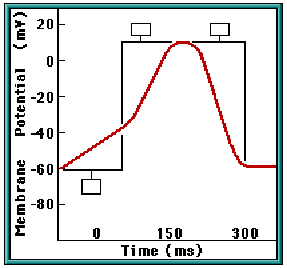 . Note that the cell starts out at resting membrane potential (~-60 mV), positive out, negative in.