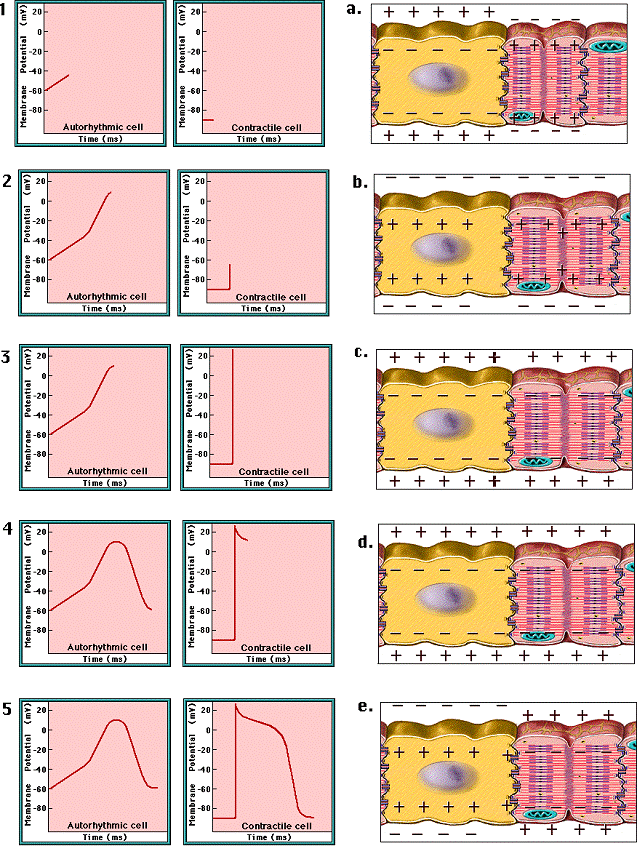 . If depolarization reaches threshold, the contractile cells, in turn, generate action potentials, first depolarizing then repolarizing. After depolarization, the cardiac myofibrils in contractile cells slide over each other resulting in muscle contraction. After repolarization these cells relax.