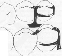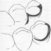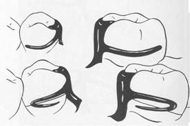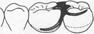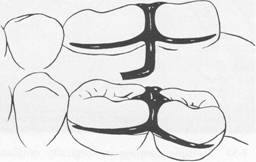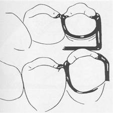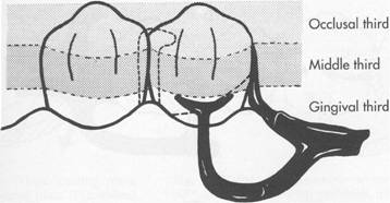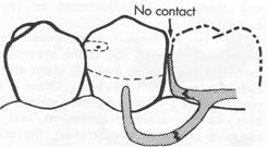 tive areas are available or when multiple restorations are justified, clasping can be accomplished by means of an embrasure clasp (Figs. 7-32 and 7-33). Sufficient space must be provided between the abutment teeth in their occlusal third to make room for the common body of the embrasure clasp (Fig. 7-34), yet the contact area should not be eliminated entirely. Historically, this clasp assembly demonstrates a high percentage of fracture caused by inadequate tooth preparation in the contact area. Because vulnerable areas of the teeth are involved, abutment protection with inlays or crowns is recommended. The decision to use unprotected abutments must be made at the time of oral examination and should be based on the patient's age, caries index, and oral hygiene, as well as on whether existing tooth contours are favorable or can be made favorable by tooth modification. Preparation of adjacent, contacting, uncrowned abutments to receive any type |