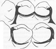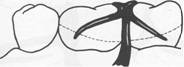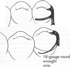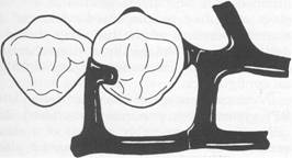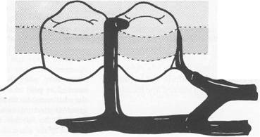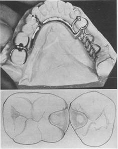 Fig.7-32 Embrasure clasp used where no edentulous space exists. Although in this drawing both retentive clasp arms are located on buccal surface and nonretentive arms on lingual surface, retention and reciprocation can be reversed on both teeth or on either tooth, depending on respective contours of the teeth. However, if second molar is sound and suitable stabilizing and retentive areas can be found, circum ferential clasp originating on distal surface of abutment is preferable. |