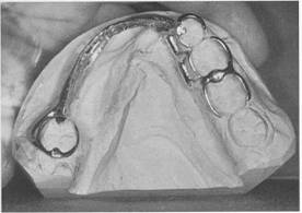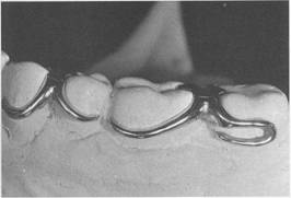 wrought-wire retentive arm than with the cast, half-round retentive arm. The disadvantages listed previously should not prevent its use regardless of the type of alloy being used for the cast framework. Technical problems are minimized by selecting the best wrought wire for this purpose and then either casting to it or soldering it to the cast framework. Selection of wrought wire, attachment of it to the framework, and subsequent laboratory procedures to maintain its optimum physical properties are presented in Chapter 12. The patient may be taught to avoid distortion of the wrought wire by explaining that to remove the partial dentures, the fingernail should always be applied to its point of origin, where it is held rigid by the casting, rather than to the flexible terminal end. Often, lingual retention may be used rather than buccal retention, especially on a mandibular abutment, so that the wrought-wir_ arm is never touched by the patient during removal of the denture. |
