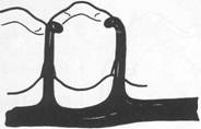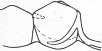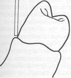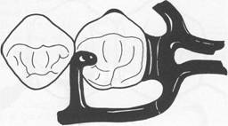 Fig. 7-39 Reverse-action, or hairpin, clasp arm may be used on abutments of tooth-supported dentures when proximal undercut lies below point of origin of clasp (mirror view), It may be esthetically objectionable and covers considerable tooth surface. It should be used only when a bar-type retentive arm is contraindicated because of a tissue undercut, tilted tooth, or shallow vestibule. |