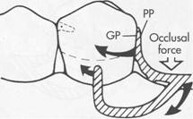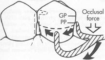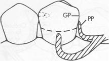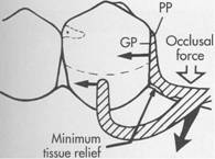 Fig. 7.42 Bar clasp assembly where guiding plane (GF) and corresponding proximal plate (PP) extend entire length of proximal tooth surface. Physiologic relief is required to prevent impingement of gingival tissues during function. Extending proximal plate to contact greater surface area of guide plane directs functional forces in horizontal direction, thus tooth (teeth) are loaded more than edentulous ridge. |