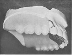 Fig. 7-48 Bar clasp arm on maxillary terminal abutment. Note uniform taper from point where it will emerge from resin base and that it engages tooth undercut on side adjacent to distal extlmsion base. Butt-type joint for finishing line between direct retainer and acrylic resin base is provided. |