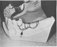 Fig. 7-49 Bar clasp arm on lower molar abutment engaging mesiobuccal undercut. Note proper use of parallel proximal guiding planes. |