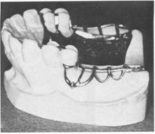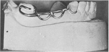Fig. 7-33 Multiple clasping in surgically mutilated mouth. On the right are embrasure clasp, bar clasp arm, and conventional circumferential clasp engaging lingual undercuts on three abutment teeth. On the left is well-designed ring clasp engaging lingual undercut, with supporting strut on buccal surface and auxiliary occlusal rest to prevent mesial tipping. Note rigid design of major connector. |