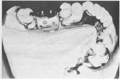 away from the distal extension base. Situations often exist, however, in which a bar clasp arm may be used to advantage without jeopardizing a terminal abutment. A bar clasp arm swinging distally into the undercut may be a logical choice, since movement of the clasp on the abutment as the distal extension base moves tissueward is minimized by the distal location of the clasp terminal. The specific indications for using a bar clasp arm are (1) when a small degree of undercut (0.01 inch) exists in the cervical third of the abutment tooth, which may be approached from a gingival direction; (2) on abutment teeth for tooth-supported partial dentures or toothsupported modification areas (Fig. 7-51); (3) in distal extension base situations; and (4) in situations in which esthetic considerations must be accommodated and a cast clasp is indicated. Thus use of the bar clasp arm is contraindicated when a deep cervical undercut exists or when a severe tooth and/or tissue undercut exists, either of which must be bridged by excessive blockout. When severe tooth and tissue undercuts exist, a bar clasp arm usually is an annoyance to the tongue and cheek and also traps food debris. |