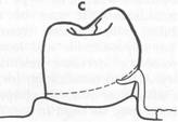 Fig. 7-52 Contraindications for selection of bar-type clasps. A, Severe buccal or lingual tilts of abutment teeth. H, Severe tissue undercuts. C, Shallow buccal or labial vestibules. |