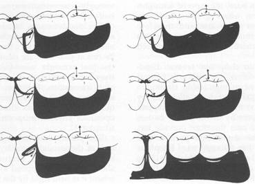 Other limiting factors in the selection of a bar clasp assembly include a shallow vestibule or an excessive buccal or lingual tilt of the abutment tooth (Fig. 7-52). Some common errors in the design of bar-type clasps are illustrated in Fig. 7-53. There are several other types of bar clasps, one of which is the infrabulge clasp. It is designed so that the bar arm arises from the border of the denture base, either as an extension of a cast base or attached to the border of a resin base (Fig. 7-54). It is made more flexible than the usual bar clasp arm in that the portion of the cast base that gives rise to the clasp arm is separated from the clasp arm itself, either by a saw cut or by being cast against a separating shim of matrix metal, which is later removed with acid. It may be made more flexible through the use of wrought wire, which is attached to a metal base by soldering or is embedded in the border of a resin base. Some of the advantages attributed to the infrabulge clasp are (1) its interproximallocation, which may be used to esthetic advantage; (2) increased retention without tipping action on the abutment; and (3) less chance of accidental distortion resulting from its proximity to the denture border. The wearer .should be meticulous in the care of a denture so made, not only |