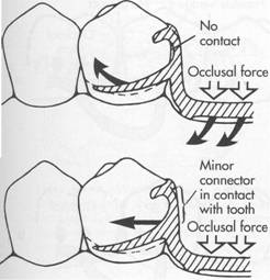 Fig. 7-57 A, Minor connector supporting distal rest does not contact prepared guiding plane, resulting in uncontrolled stress to abutment tooth. B, Minor connector contacts prepared guiding plane and directs stresses around arch through proximal contacts. |